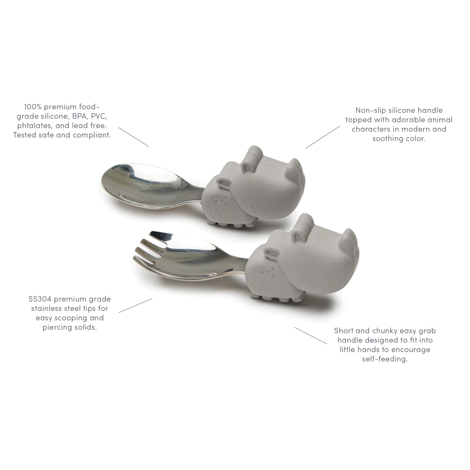 When your baby starts using utensils, there’s always a steep learning curve (read: a big mess). Our toddler learning spoon and fork set is perfectly sized for little hands to encourage self-feeding with chunky easy-grab handles. Made of buttery smooth premium platinum food-safe silicone and SS304 stainless steel, this set is available in our exclusive animal characters.