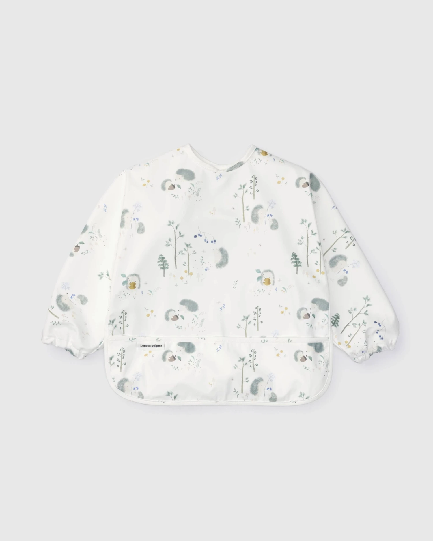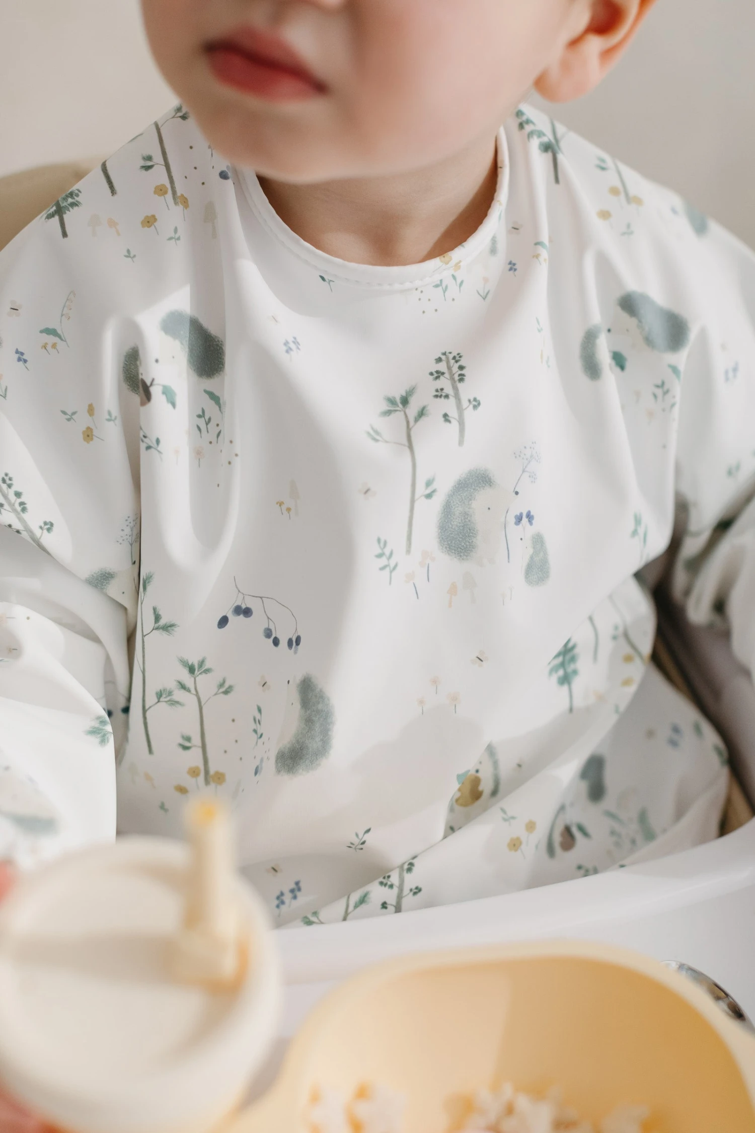 Hate doing extra laundry? Well, this full-coverage bib just became your saving grace. Our long sleeve waterproof bib is made with 100% responsibly sourced recycled polyester with TPU coating that is waterproof, stain, and odor resistant. Standard 100 by Oeko-tex certified. Designed with an adjustable neckline with snaps and elasticized cuffs allow for a comfortable fit that grows with baby to toddler from 6 months to 3 years old.