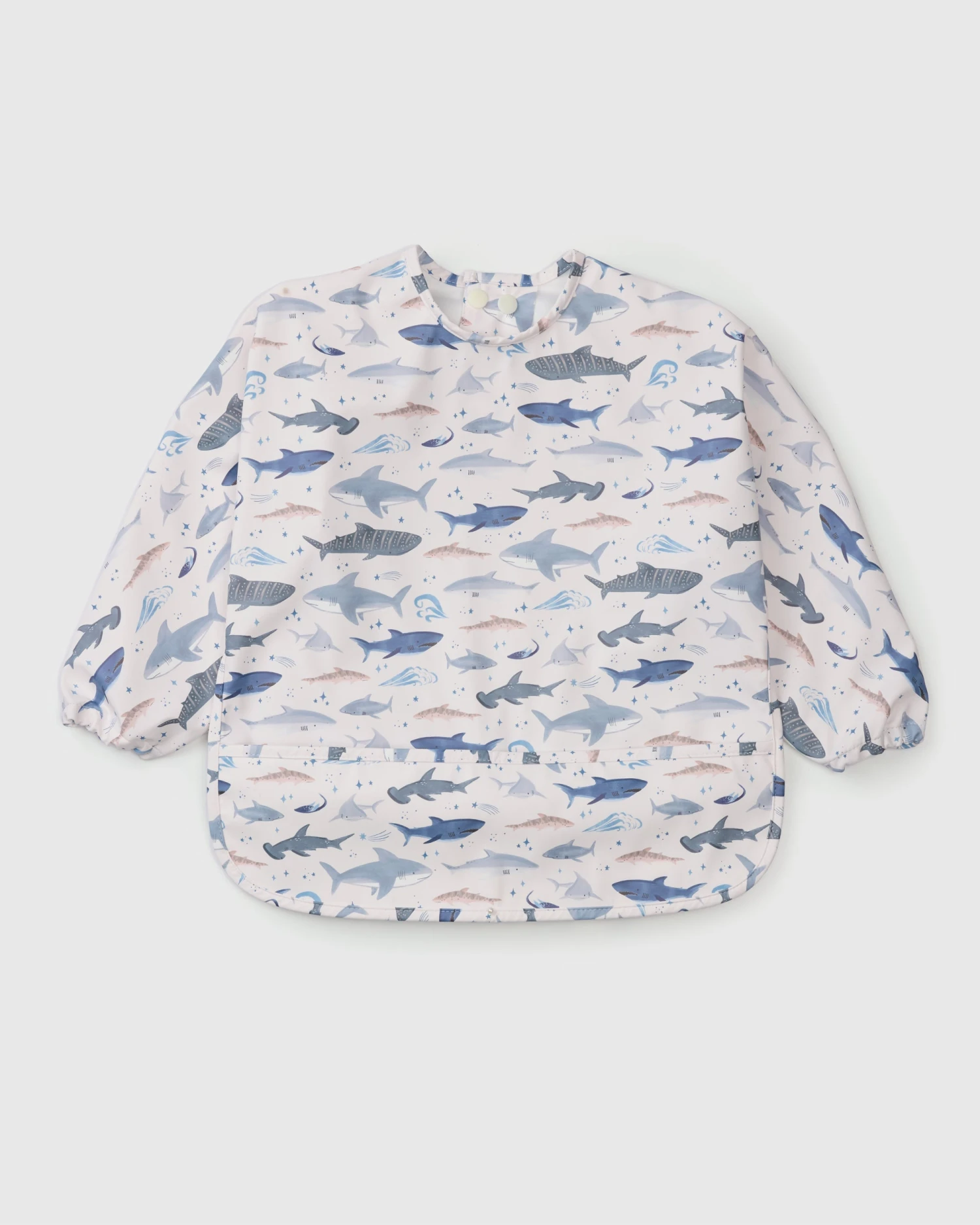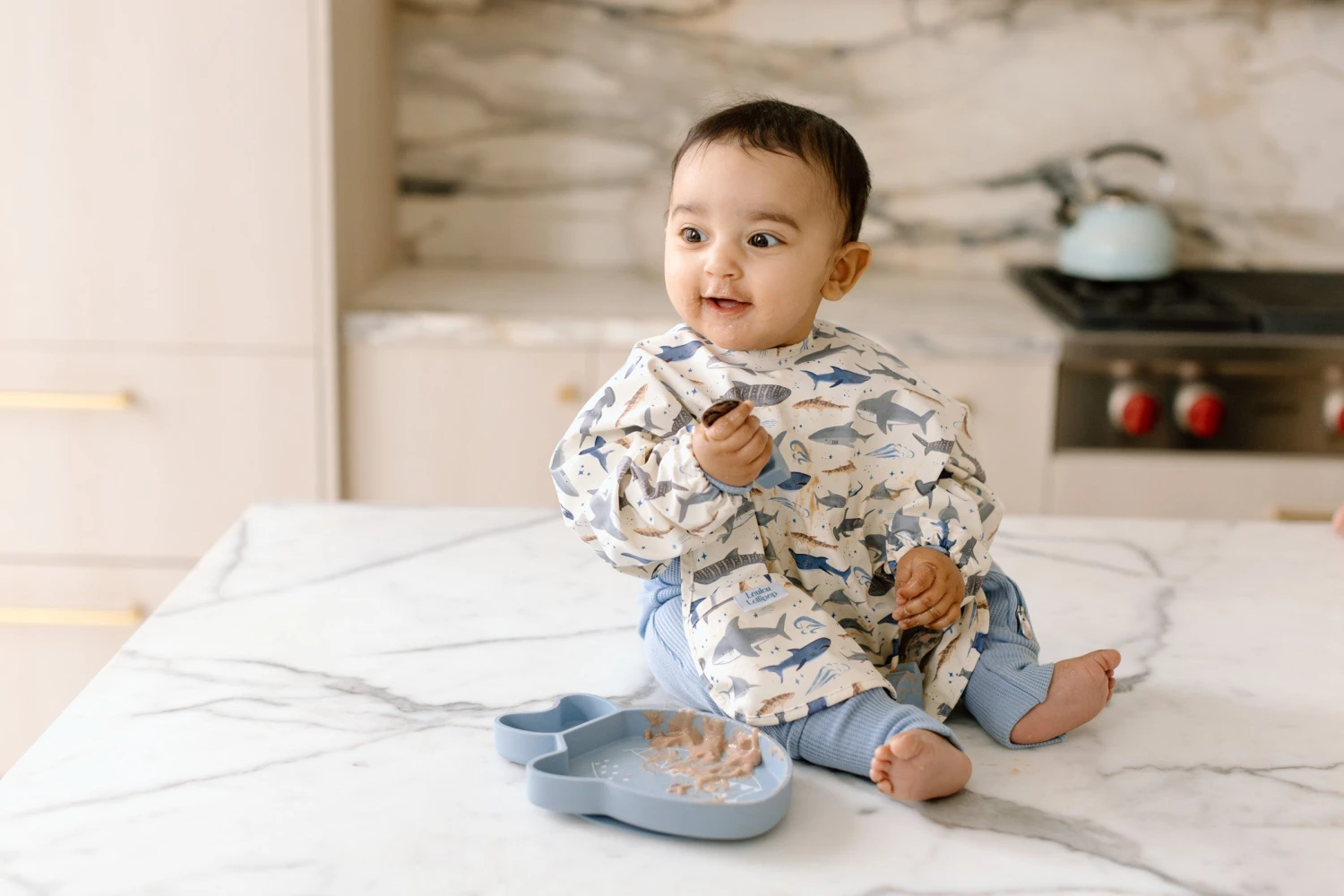 Hate doing extra laundry? Well, this full-coverage bib just became your saving grace. Our long sleeve waterproof bib is made with 100% responsibly sourced recycled polyester with TPU coating that is waterproof, stain, and odor resistant. Standard 100 by Oeko-tex certified. Designed with an adjustable neckline with snaps and elasticized cuffs allow for a comfortable fit that grows with baby to toddler from 6 months to 3 years old.