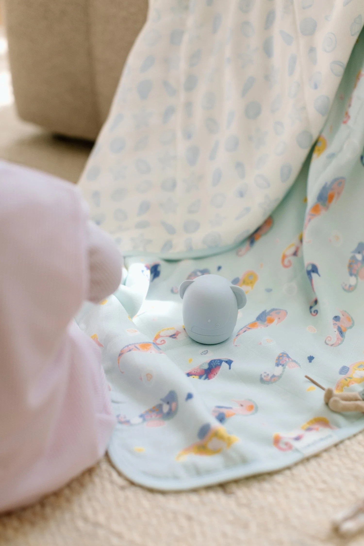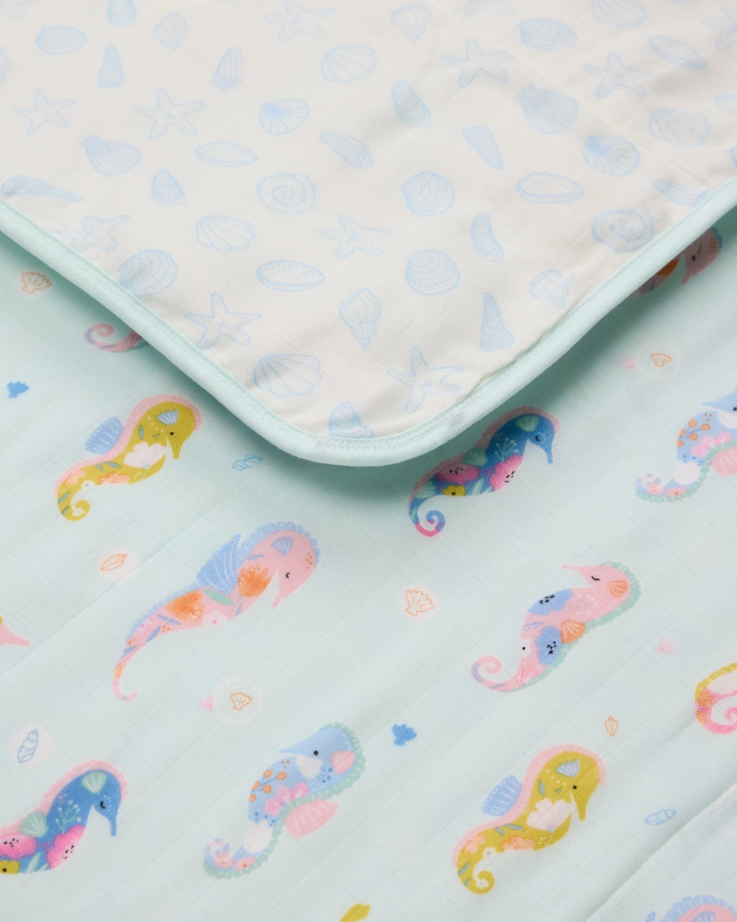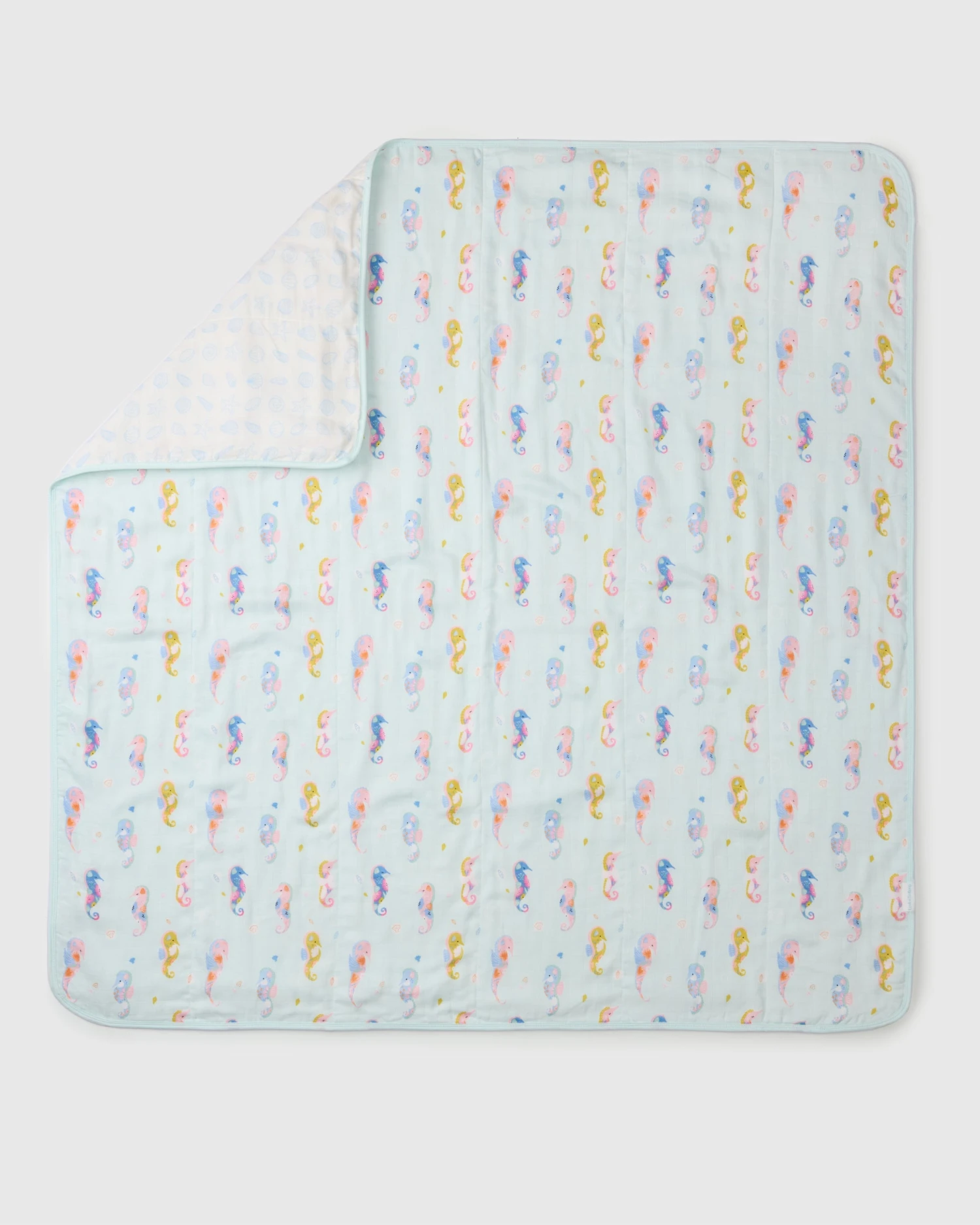 Our muslin quilts made from four layers of bamboo and cotton muslin fabric offer the perfect amount of breathable warmth and coziness to keep the baby comfortable and relaxed. This large reversible blanket is lightly quilted and features hand-drawn watercolor prints.