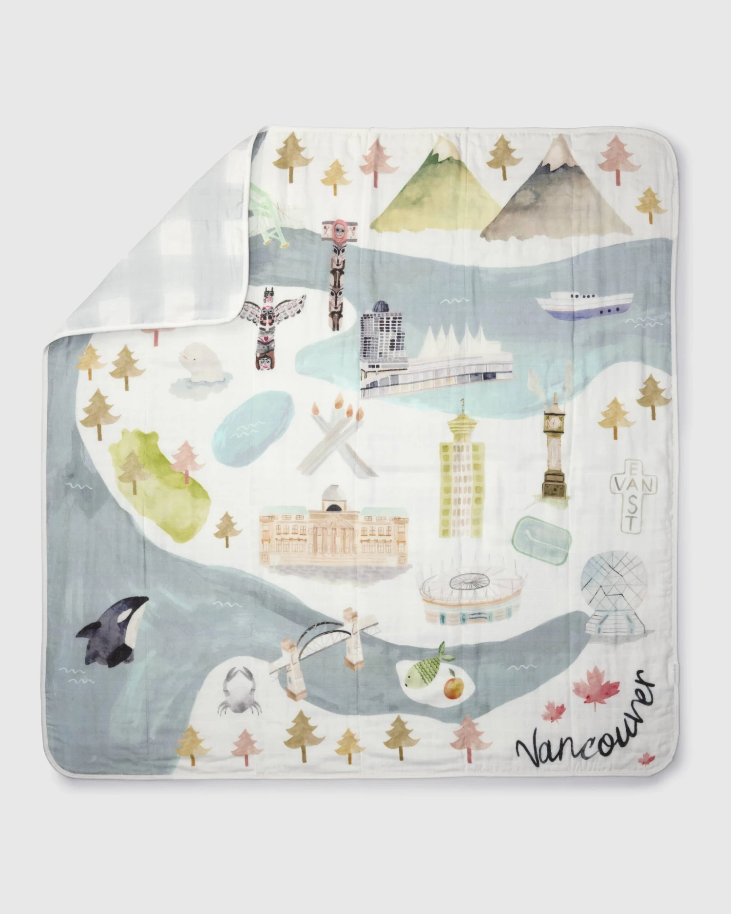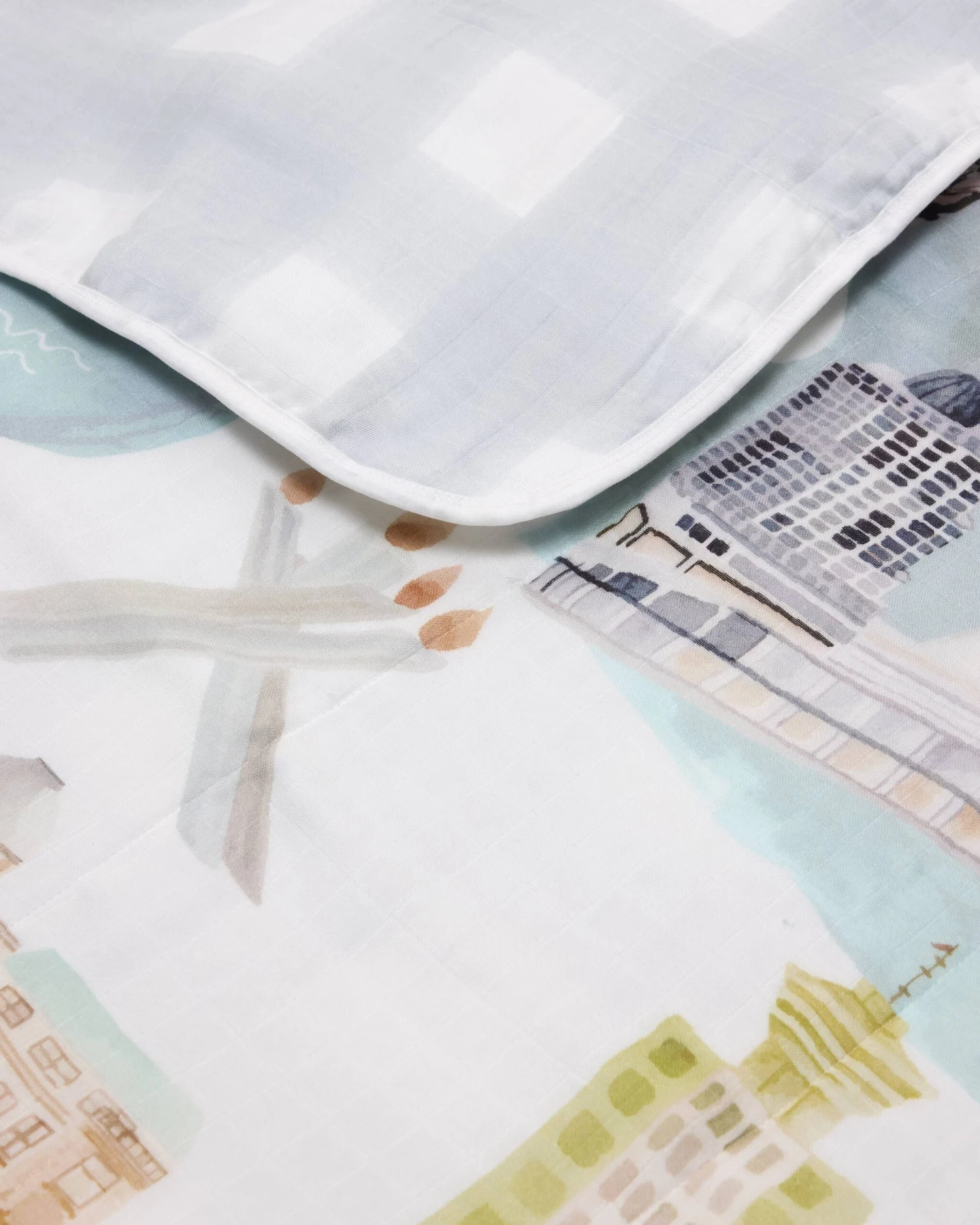 Our muslin quilts made from four layers of bamboo and cotton muslin fabric offer the perfect amount of breathable warmth and coziness to keep the baby comfortable and relaxed. This large reversible blanket is lightly quilted and features hand-drawn watercolor prints.