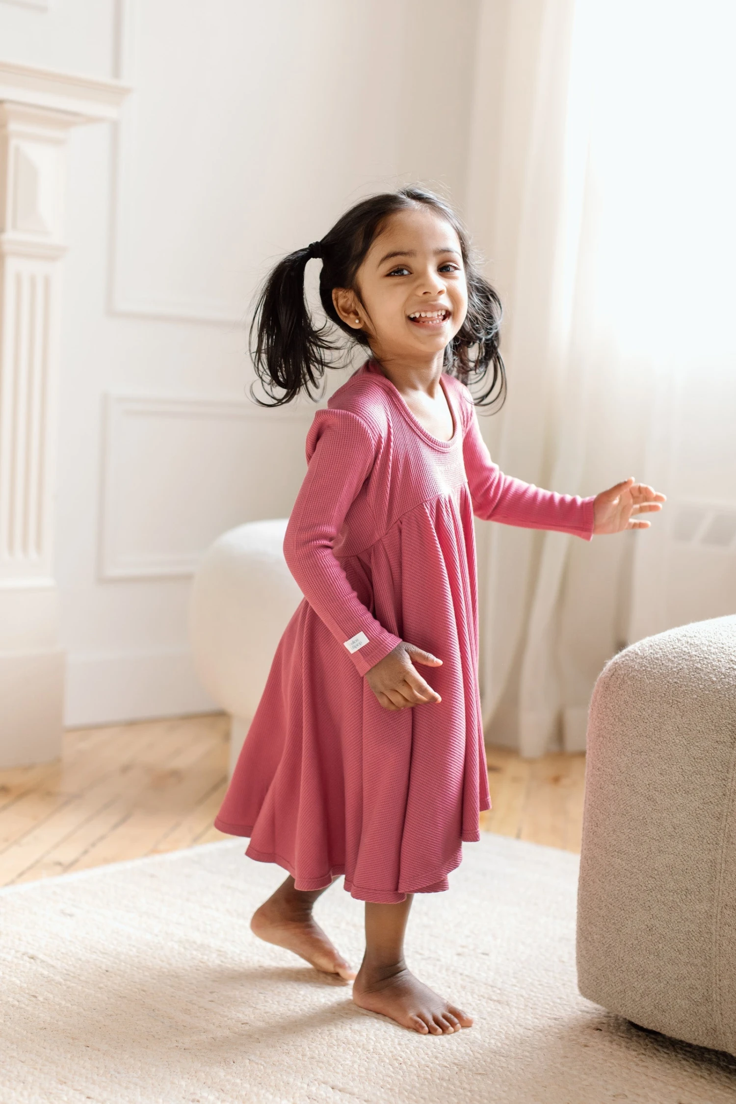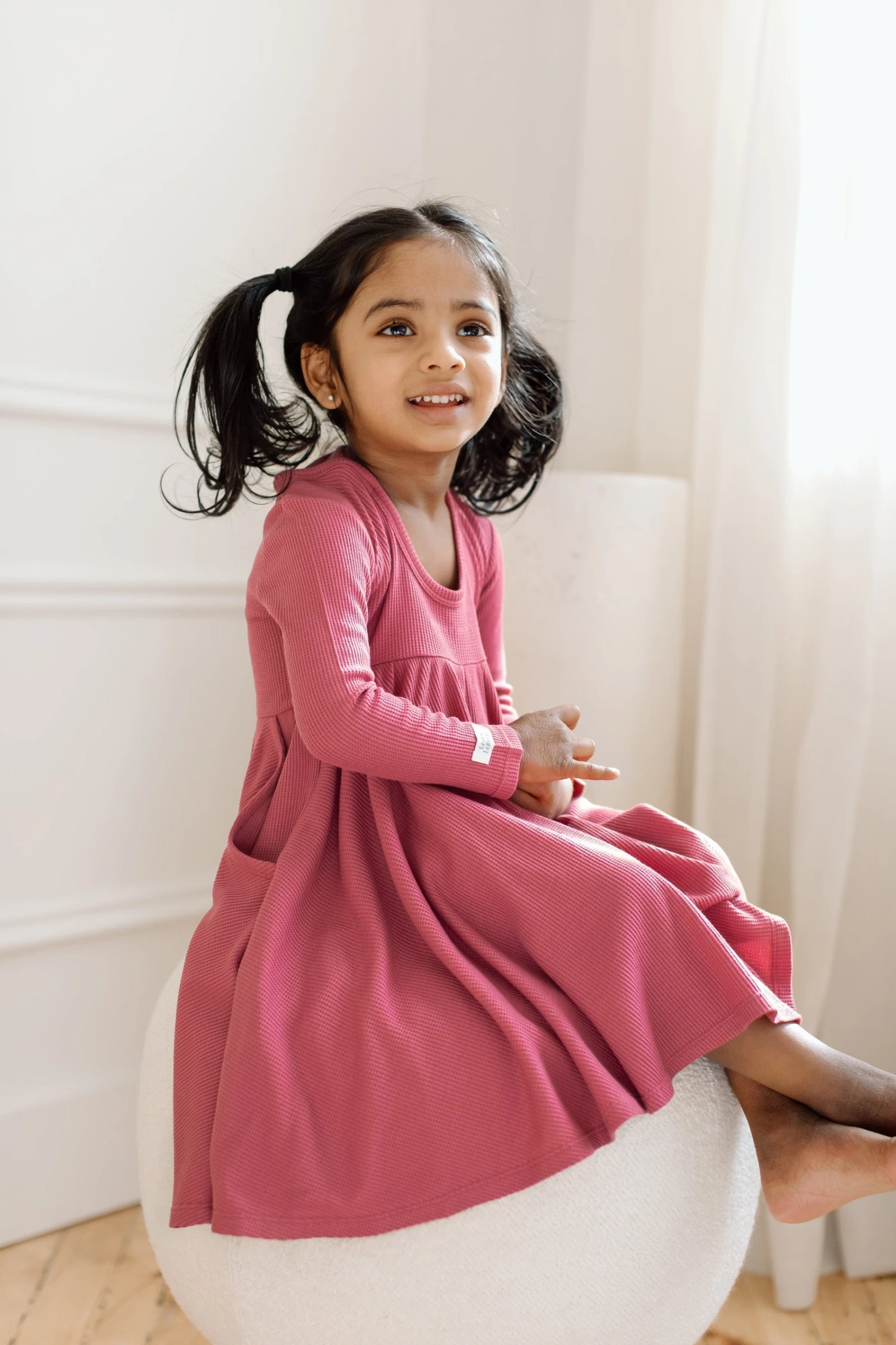 A dress is designed for twirling! Made with our signature soft and sustainable TENCEL ™ Lyocell waffle jersey, it has a fitted bodice, a scoop back adorned with a bow, and oversized side pockets for where the adventure will take them.