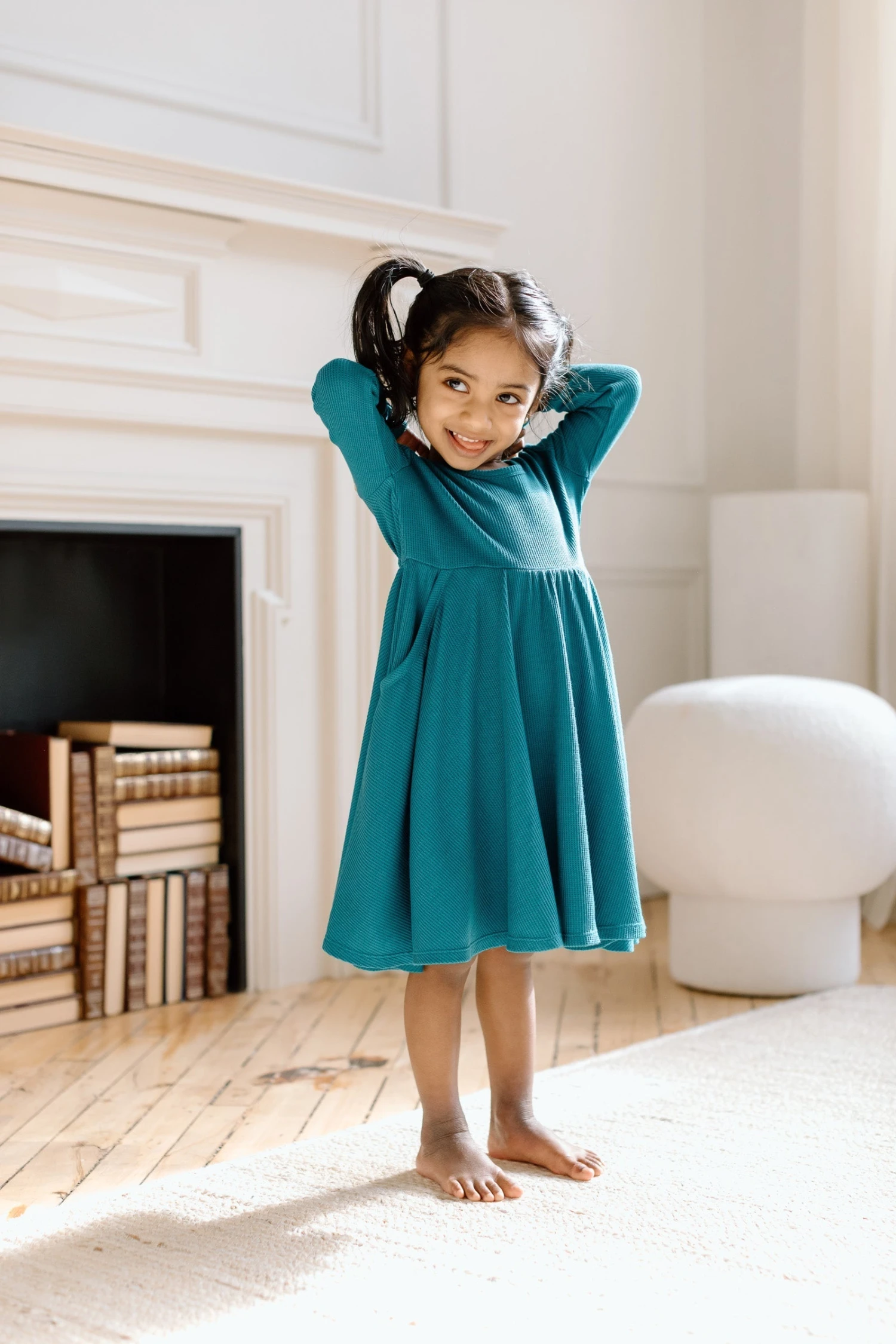A dress is designed for twirling! Made with our signature soft and sustainable TENCEL ™ Lyocell waffle jersey, it has a fitted bodice, a scoop back adorned with a bow, and oversized side pockets for where the adventure will take them.